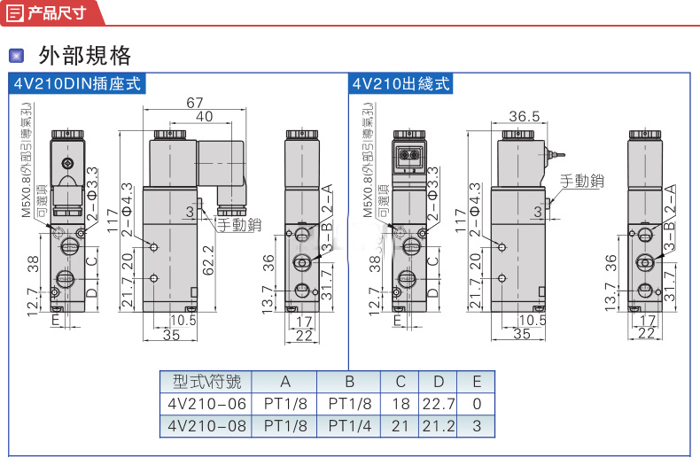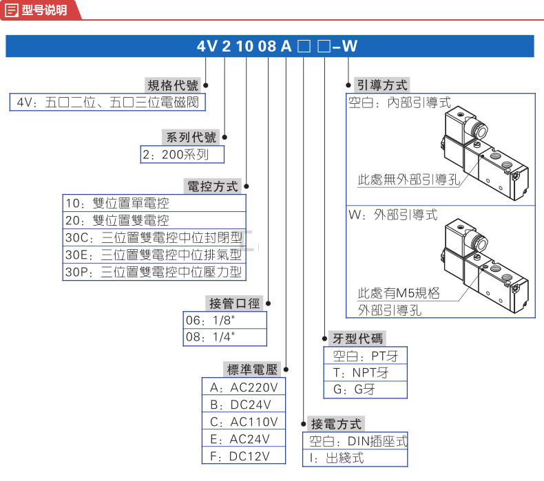 亞德客 內(nèi)部先導(dǎo)式 電磁閥 2位5通 單電控產(chǎn)品型號: